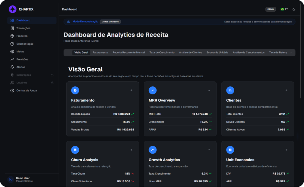 O Chartix integra todos os seus gateways apresenta as principais métricas do seu negócio em um único painel, para você tomar decisões mais seguras e baseadas em dados reais.