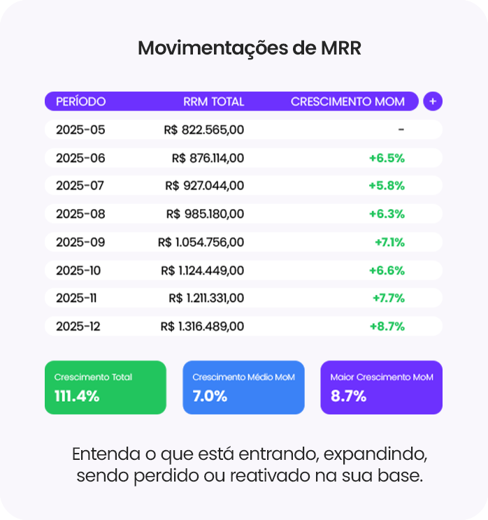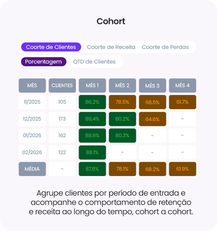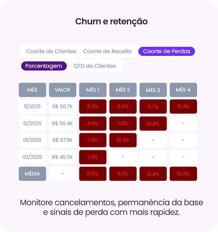 Mas quando crescimento, churn e retenção dependem de consolidação manual, a leitura real só aparece depois do fechamento.